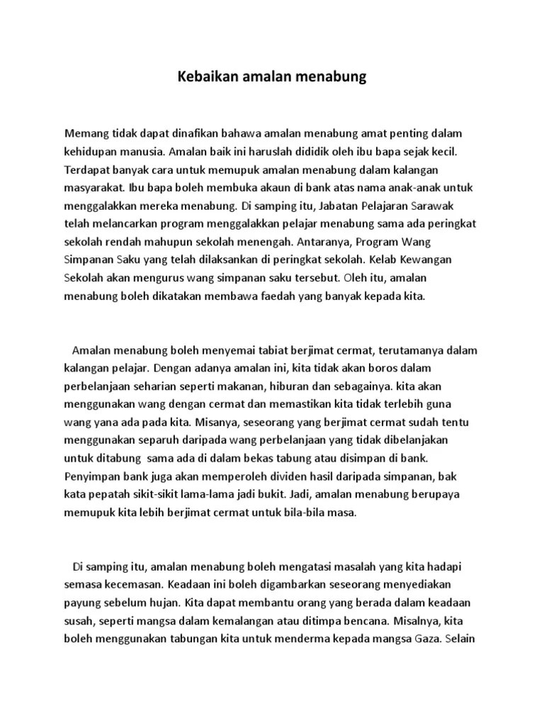 Gambaran jelas tentang kebaikan dan faedah menabung kepada semua orang. Panjangnya huraian hendaklah antara 200 hingga 250 patah perkataan. Dengan adanya jaminan seperti ini, . Bagi pelajar yang menduduki peperiksaan spm tahun ini, anda boleh membuat latihan menulis karangan spm . Contoh karangan kepentingan amalan menabung dan menyimpan wang bagi panduan menjawab karangan bahasa . Dapat digunakan untuk masa depan. Kebaikan amalan menabung dalam kalangan masyarakat. aa oleh hal yang demikian, kebaikan amalan menabung yang mewarnai fokus perbincangan akan dikupas secara terperinci untuk kepentingan bersama. Tidak boros dan menyebabkan pembaziran Dari kecil sehingga ke peringkat dewasa amalan menabung merupakan salah satu. Amalan menabung perlu dipraktikkan dalam kehidupan untuk mewujudkan masyarakat yang berjimat cermat. Menggunakan wang dengan cermat · amalan menabung untuk mengatasi kecemasan · kepentingan menabung untuk hari tua · faedah menabung membiayai keperluan semasa .